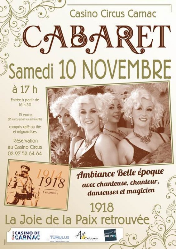 A 17h à 19h. Casino Circus 41 avenue des SalinesA 17h. Après-midi Cabaret. A l?occasion du centenaire 14-18, ambiance Belle époque avec chansons de l?époque, danseuses et magicien. La joie de la paix retrouvée après l?armistice 1918. Casino Circus 41 avenue des Salines. 15? café ou thé et mignardises compris 13? pour les adhérents Art & Culture. Réservation à partir du 1er novembre au 02 97 52 64 64