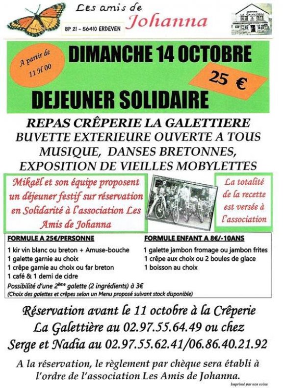 Mikaël et son équipe proposent un déjeuner festif sur réservation en solidarité à l'association Les Amis de Johanna. La totalité de la recette est versée à l'association. A partir de 11h : repas crêperie La Galettière, buvette extérieure ouverte à tous, musique, danses bretonnes, exposition de vieilles mobylettes.- Formule à 25?/personne :1 kir vin blanc ou breton + amuse-bouche ; 1 galette garnie au choix ; 1 crêpe garnie au choix ou far breton ; 1 café & 1 demi de cidre. Possibilité d'une 2ème galette (2 ingrédients) à 3?.- Formule enfant à 8?/enfant de moins de 10 ans : 1 galette jambon fromage ou jambon frites ; 1 crêpe au choix ou 2 boules de glace ; 1 boisson au choix Choix des galettes et crêpes selon un Menu proposé suivant stock disponible. Réservation avant le 11 octobre à la crêperie. A la réservation, le règlement par chèque sera établi à l'ordre de l'association les Amis de Johanna.