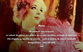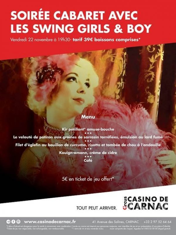 A 19h30. 39? sur résa au Casino CircusA 19h30. Dans une ambiance de plumes, de strass et de paillettes, la troupe des Swing Girls and Boy propose des spectacles de music-hall. Unique dans le Morbihan, cette troupe vous transporte par-delà les frontières. Kir pétillant amuse-bouche. Le velouté de potiron aux graines de sarrasin torréfiées, émulsion au lard fumé. Filet d?églefin au bouillon de curcuma, risotto et tombée de chou à l?andouille. Kouign-amann, crème de cidre. Café.1 verre de vin et eau minérale compris. Tarif 39? boissons comprises + 5? en ticket de jeu ou jetons offerts.