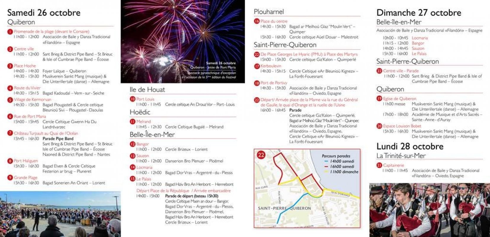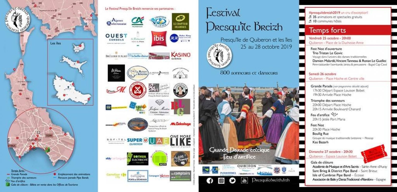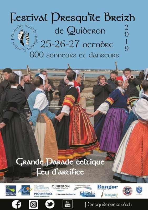 Vendredi 25, Samedi 26, Dimanche 27 octobre Festival Presqu?île Breizh de Quiberon Festival de musique et de danses bretonnes 5e édition - 800 sonneurs et danseurs ! 12 cercles celtiques & 12 bagadoù animeront la Presqu?île de Quiberon et les îles. 3 jours de fête! Programme ci-joint en photo et disponible à l?Office de Tourisme. QUIBERON, ST PIERRE QUIBERON , PLOUHARNEL, HOUAT & HOEDIC? Temps forts à Quiberon : Vendredi 20h : Fest-Noz, Place Duchesse Anne. Samedi 17h30 : Grande Parade, départ Espace Louison Bobet, 19h30 Arrivée Place Hoche. 20h: Triomphe des sonneurs , départ Place Hoche 20h15 : Spectacle pyrotechnique sur la Jetée de Port Maria 20h30 : Fest-Noz, Place Hoche. Dimanche 20h30: Gala de clôture, Espace Louison Bobet. Billets en vente à l?Office de Tourisme. Pour 2019 sont attendus? CERCLES CELTIQUES Asociación de Baile y Danza Tradicional « Filandón » (Espagne)Cercle Celtique de La Forêt-Fouesnant « Ar Bleuniou Kignez »Cercle Brizeux de LorientCercle celtique Giz?KalonFesterion ar brug ? Cercle celtique de PluneretDanserion Bro Plenuer / Cercle Celtique de PloëmelCercle celtique Aùel Douar de MalestroitCercle An Drouz Vor de Port-LouisCercle Celtique Bugalé MelrandCercle Celtique Gwenn Ha Du de LandrévarzecLa Kevrenn AlréBugale Armor Kiberen BAGADOÙ Sant Brieg & District Pipe BandIsle of Cumbrae Pipe Band (Écosse)Bagad ar Meilhoù Glaz ?Moulin Vert?Bagad Bro KemperleBagad Dor VrasBagad Hiziv Bro An HenbontBagad KadoudalBagad ElvenNaoned & District Pipe BandBagad Sonerien An OriantReine d?Arvor 2019Reine de Cornouaille 2019 Cette année le groupe de musique Musikverein Sankt Mang et le groupe folklorique de Kempten, seront de la partie !