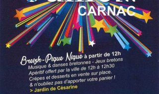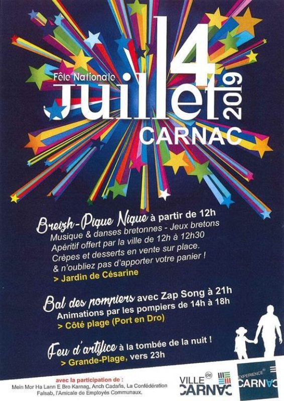 12h Breizh pique-nique Jardin de Césarine. Apportez votre pique-nique ! Musique et danses bretonnes, crêpes et jeux bretons. 14h Parcours sportif à Port en Dro. 21h Bal des pompiers et à la tombée de la nuit Feu d'artifice à Port en Dro12h Breizh pique-nique Jardin de Césarine. Apéritif offert par la ville. Apportez votre pique-nique ! Musique et danses bretonnes, crêpes et jeux bretons. 14h Parcours sportif pour les 4-12 ans à Port en Dro. 21h Bal des pompiers animé par Zap Song et à la tombée de la nuit Feu d'artifice à Port en Dro